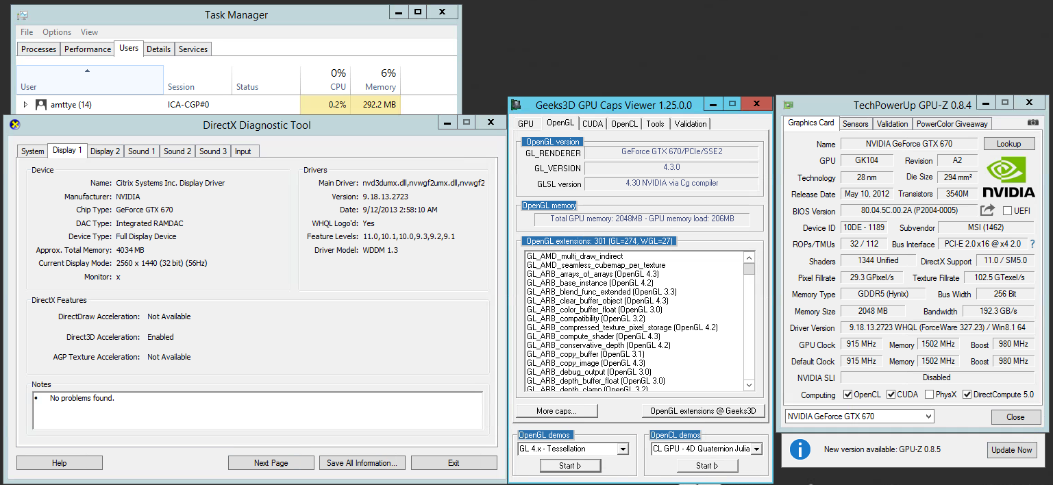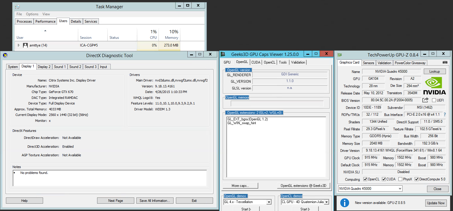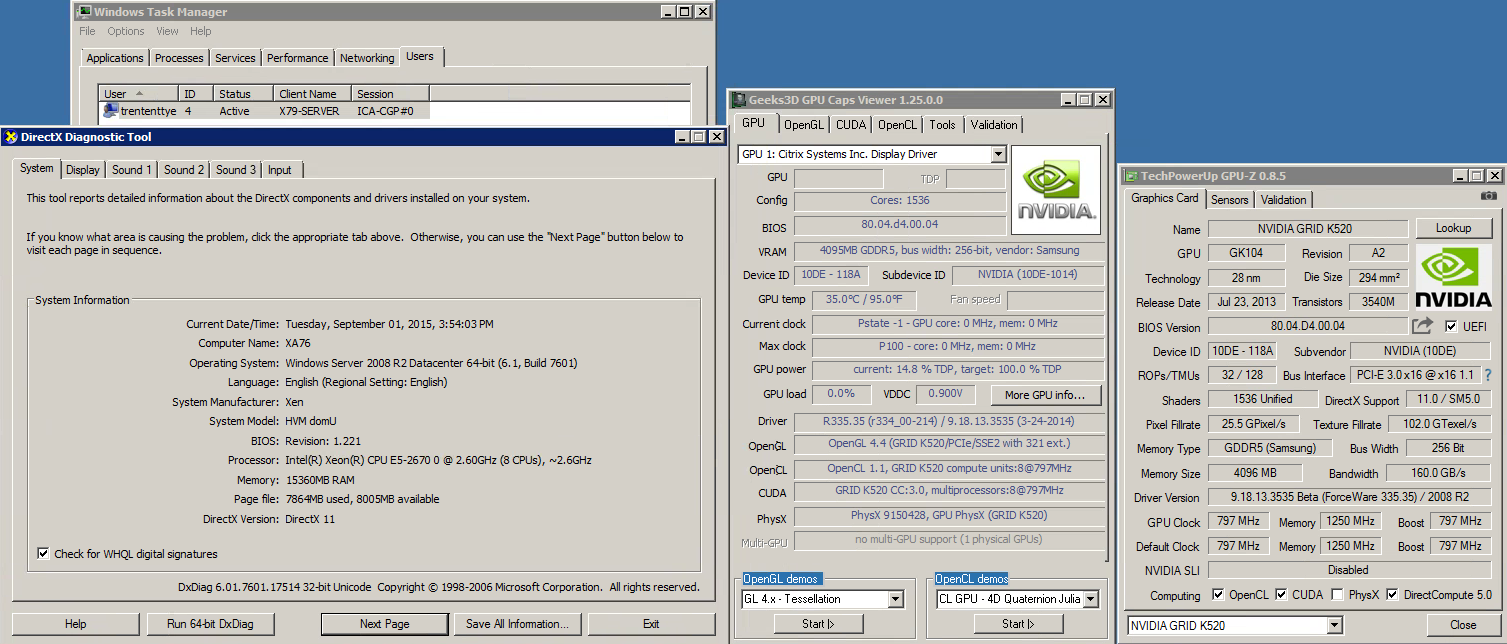 We have OpenGL working, DirectX 11, and OpenCL (the onboard Intel GPU’s do not support CUDA). So we have a full, working implementation of GPU sharing in a ICA session on a XenApp server.
