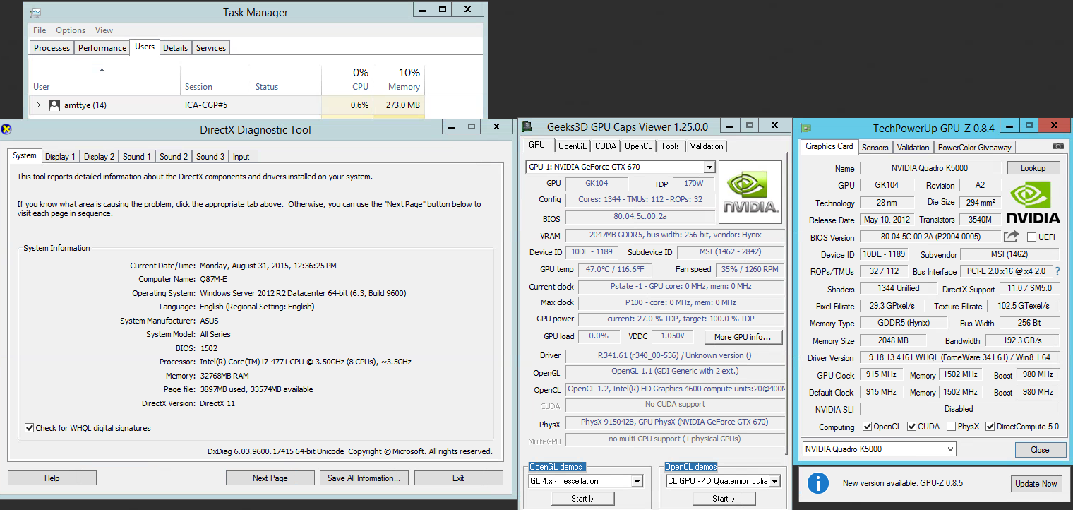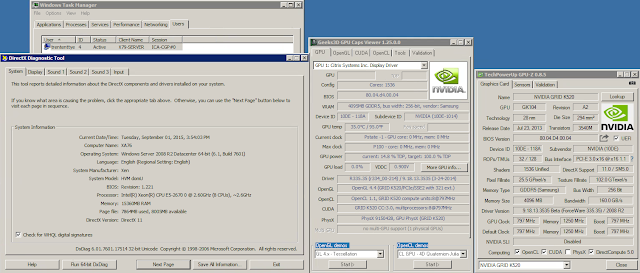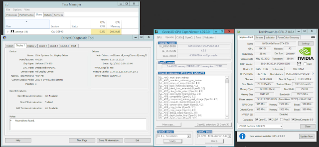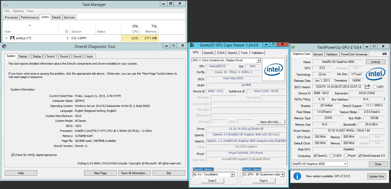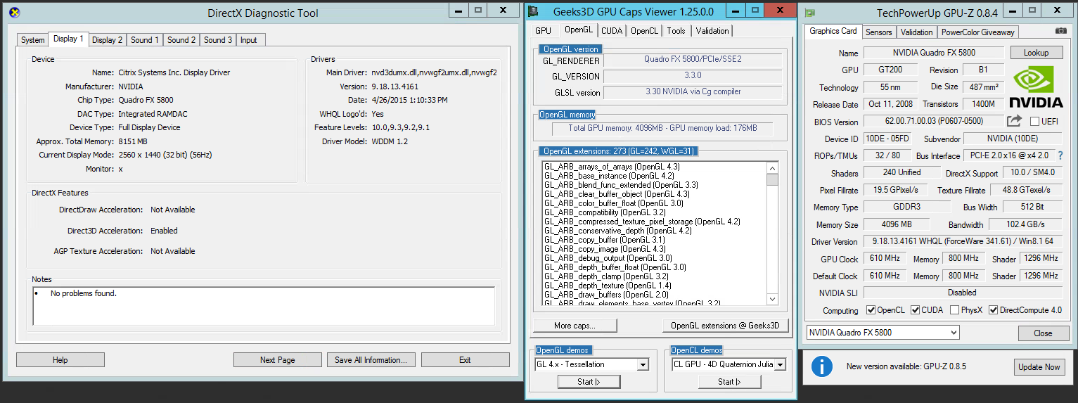 We have OpenGL working, DirectX 11, and OpenCL (the onboard Intel GPU’s do not support CUDA). So we have a full, working implementation of GPU sharing in a ICA session on a XenApp server.