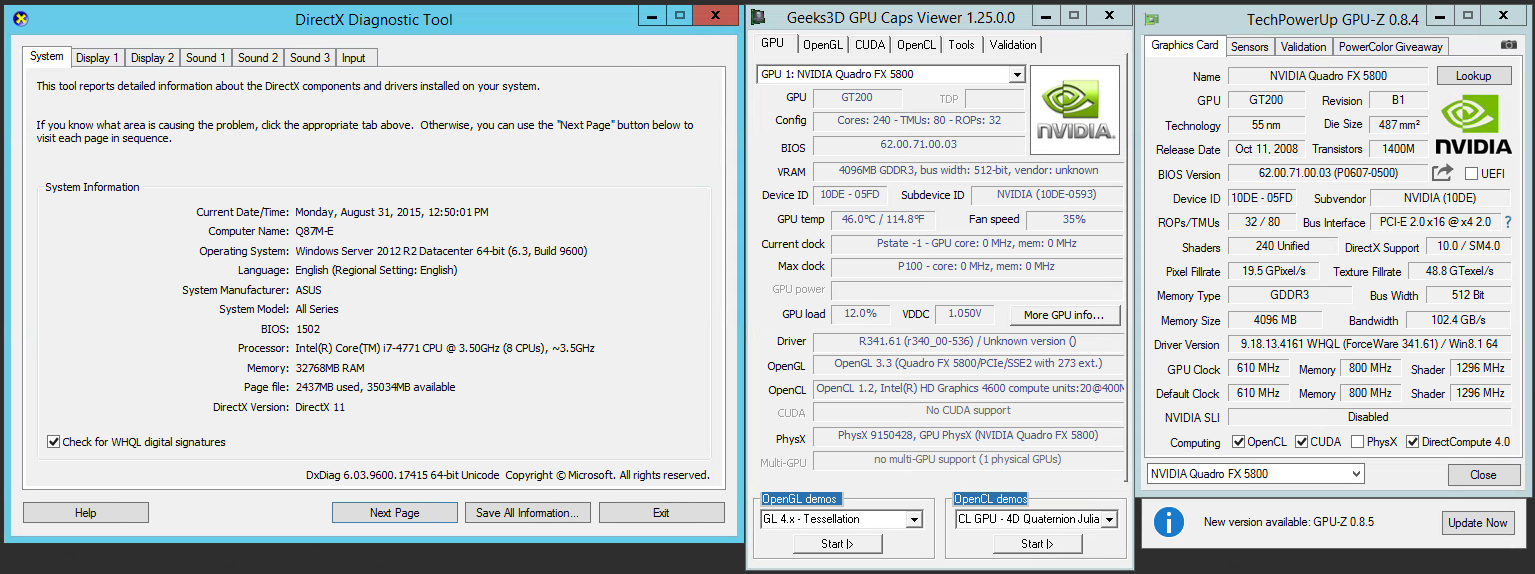 Suspecting Nvidia is doing some form of detection that is disabling OpenGL (it’s probably considered a ‘pro’-feature) I acquired a Quadro FX5800 and using the *same* modified Quadro drivers, these were my results: