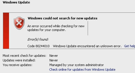 Cause: The error, 0x80244010, means WU_E_PT_EXCEEDED_MAX_SERVER_TRIPS and happens when a client has exceeded the number of trips allowed to a WSUS server. We have defined the maximum number of trips as 200 within code and it cannot reconfigured. A trip to the server consist of the client going to the server and saying give me all updates within a certain scope. The server will give the client a certain number of updates within this trip based on the size of the update metadata. The server can send 200k worth of update metadata in a single trip so it"s possible that 10 small updates will fit in that single trip. Other larger updates may require a single trip for each update if they exceed the 200k limit. Due to the way Office updates are published you are more likely to see this error if you"re syncing Office updates since their metadata is typically larger in size.