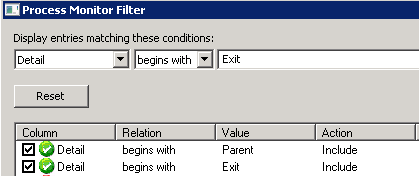 and used the “show process and thread activity”. I filtered on ‘Detail’ ‘Begins with’ and set it for both Parent and Exit so I can look at the process path and exit codes: