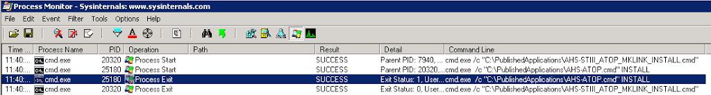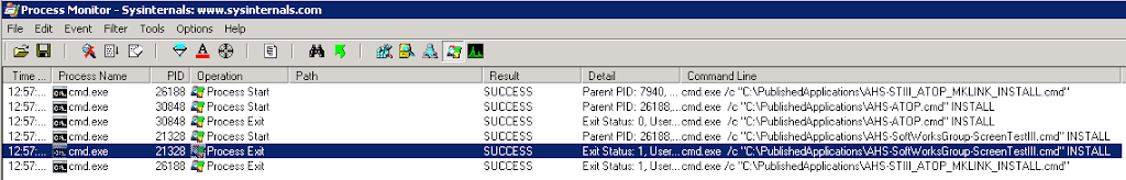 This time we can see that the ‘AHS-ATOP.cmd’ script has an ‘Exit Status: 0’ which means it completed successfully. But, the next script, ‘AHS-SoftWorksGroup-ScreenTestIII.cmd’ with the parameter ‘INSTALL’ fails with ‘Exit Status: 1’. Again, we look into the script…