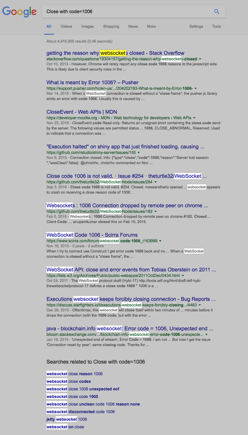 The “Close with code=1006” seemed to imply it was a “websocket” issue from google searches.