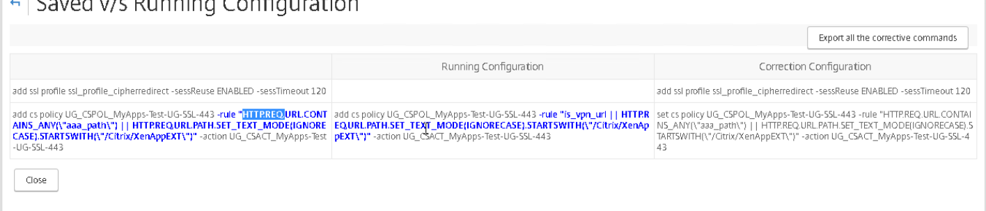 The one on the left is showing a rule for HTTP.REQ.URL.CONTAINS_ANY(“aaa_path”) where the one on the right just shows “is_vpn_url”. Investigating further it was stated that our team was trying to get AAA authentication working and this was an option set during a troubleshooting stage. Apparently, it was forgotten or overlooked when the issue was resolved (it was not applicable and can be removed). So we set it back to having the “is_vpn_url” and retried…