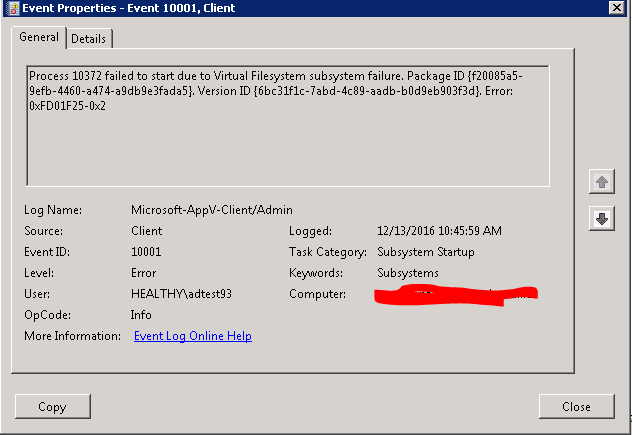 [3]0CE0.2264::2016-12-13 10:25:56.673 [Microsoft-AppV-Client]Process 18552 failed to start due to Virtual Filesystem subsystem failure. Package ID {f20085a5-9efb-4460-a474-a9db9e3fada5}. Version ID {6bc31f1c-7abd-4c89-aadb-b0d9eb903f3d}. Error: 0xFD01F25-0x2