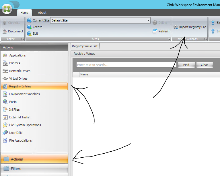 Switching to WEM I select “Actions” then “Registry Entries” and then I imported the registry file.