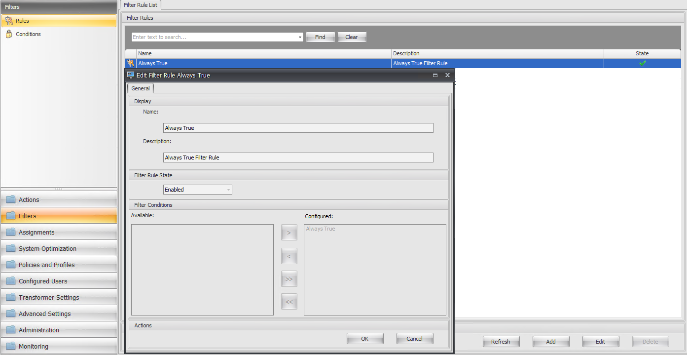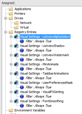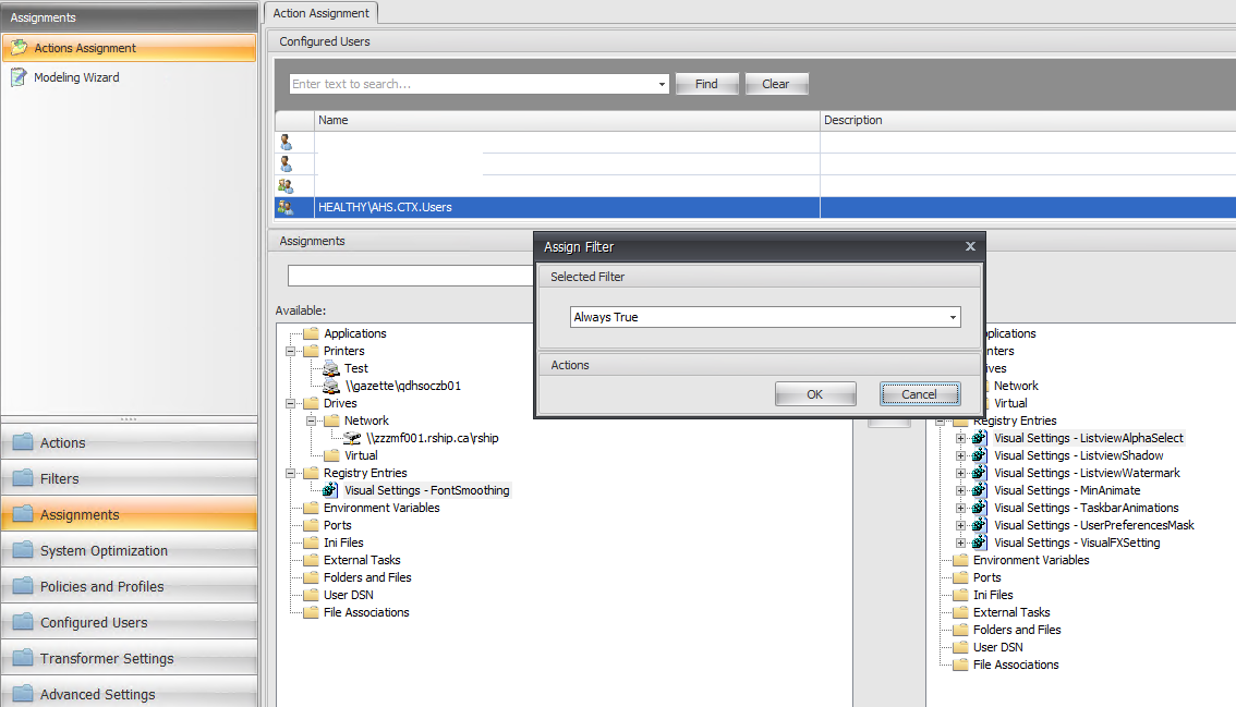 We have a user group that encompasses all of our Citrix users upon which I added in “Configure Users”. Then, during the assignment of the registry keys I selected the “Always True” filter: