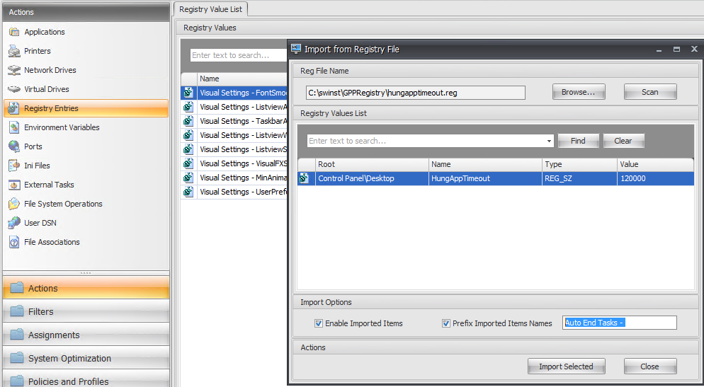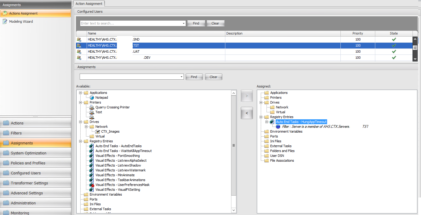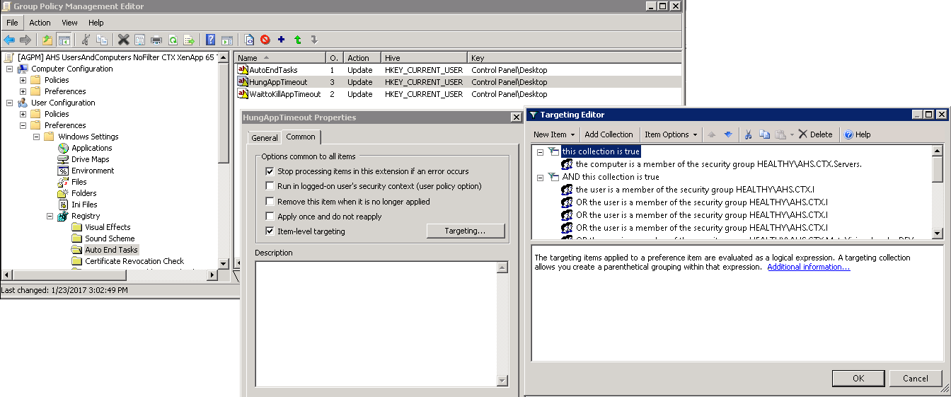 An easy solution might be to create a super-group “HungAppTimeout” or some such and add all the groups I want that value to apply to that group. Another alternative is we can ‘configure’ each user group with the ‘server must belong to group’ filter and that should satisfy the same requirements. I chose this route for our evaluation of WEM to avoid creating large swaths of groups simply for the purpose of applying a single registry entry.