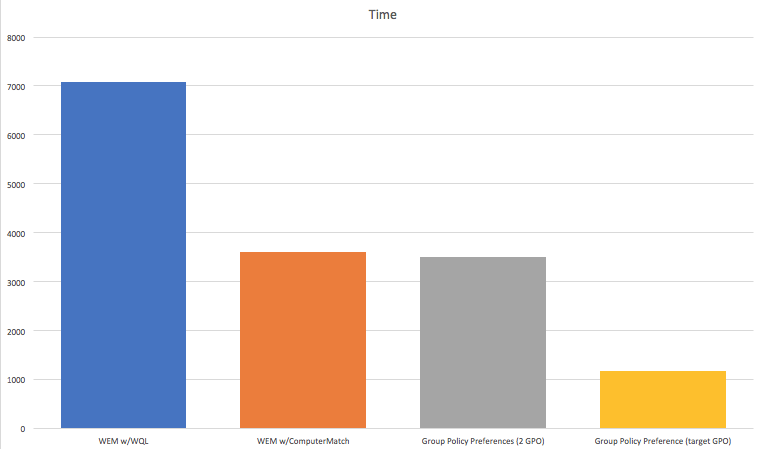 Hmmm. About twice as slow. It is certainly possible that the WMI queries are what is killing my performance, but without a way to check the group membership of the server the user is on, I am hobbled. It’s possible that if we were implementing WEM from the get go we could think of a naming scheme that would work better for us, with the limitations of the wildcard (although I think it’s a bug in WEM as opposed to a poor naming scheme - just my opinion), but to rework our entire environment is not feasible.