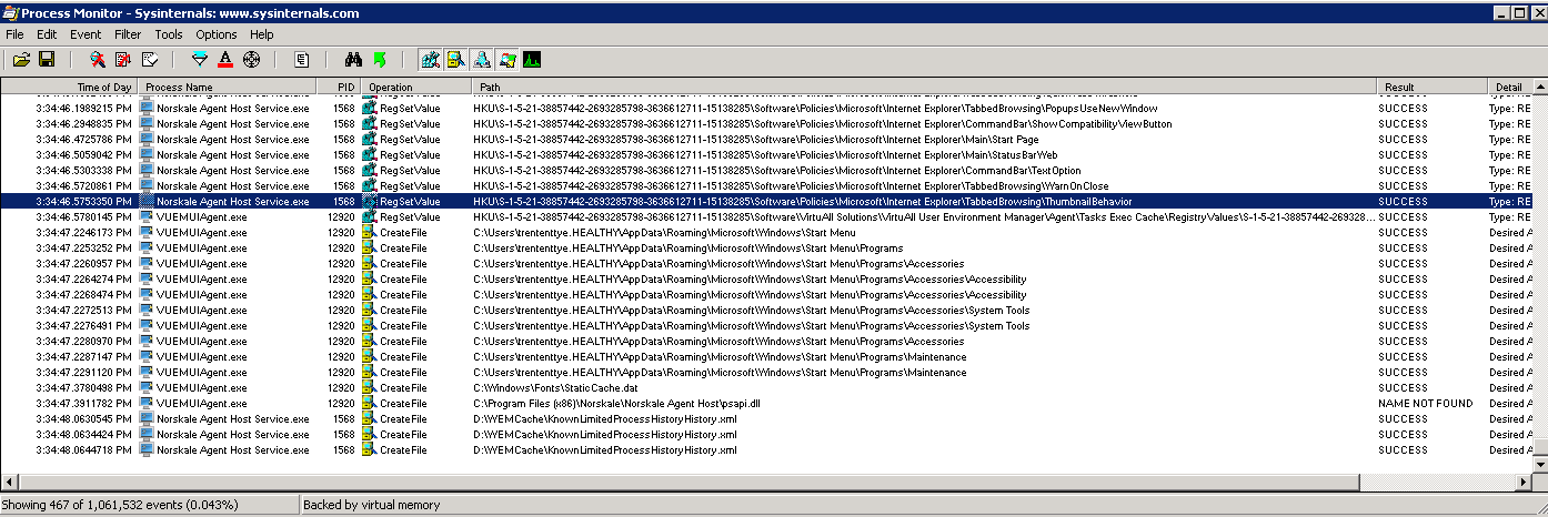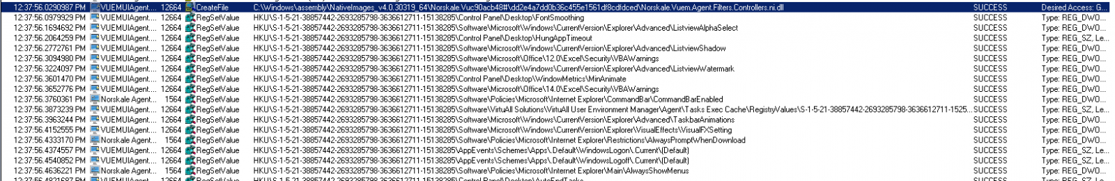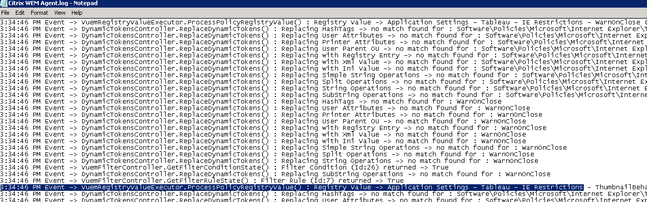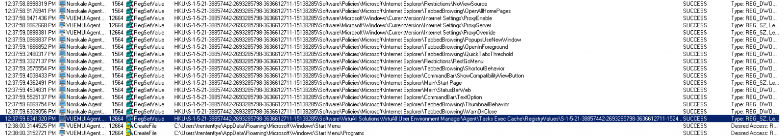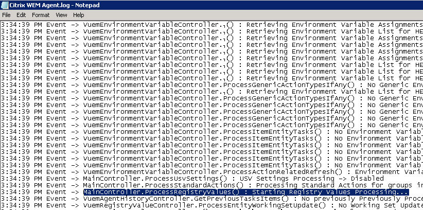 The entry I’m looking for in WEM is “MainController.ProcessRegistryValues()”. This tells us when it starts doing the registry work: