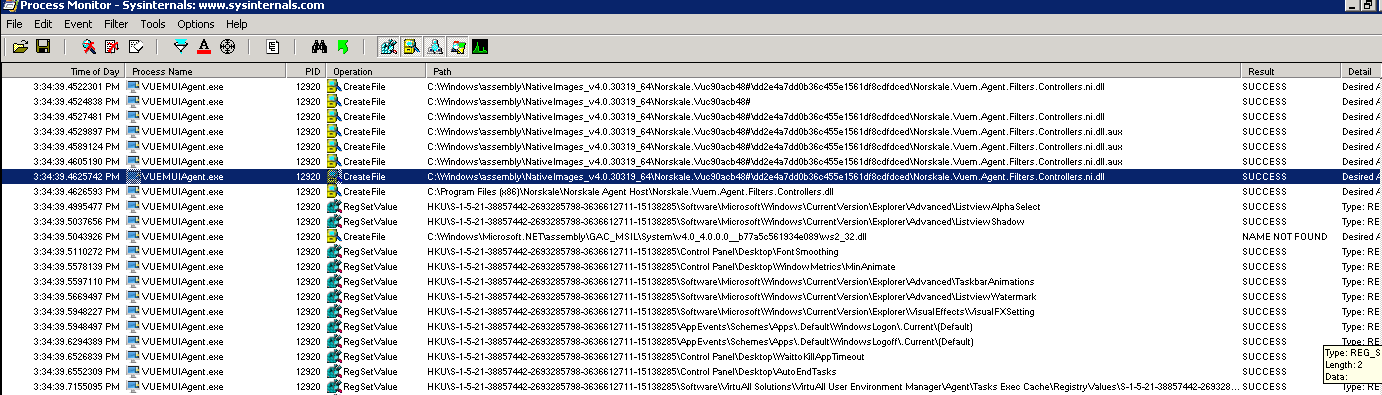 In order to compare these two I’ve subscribed to an old standby - Procmon. I logged into one of my Citrix servers with another account, and started procmon. I then launched an application published on this server (notepad). I used ControlUp to measure the performance of the actual logon and group policy extension processing. The one we are particularly interested in is the Group Policy Registry entry. This measures the performance of the Group Policy Registry portion: