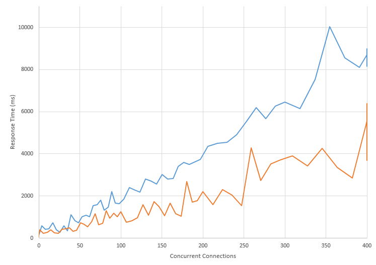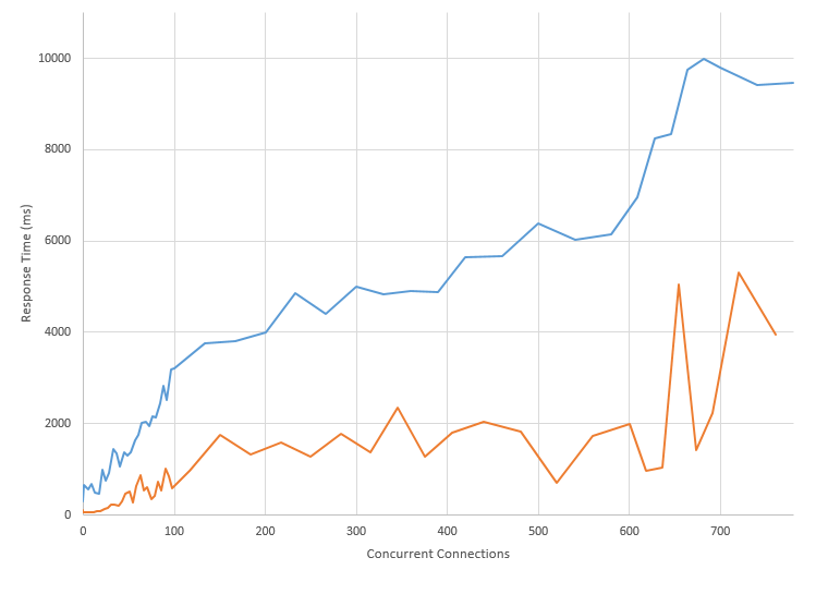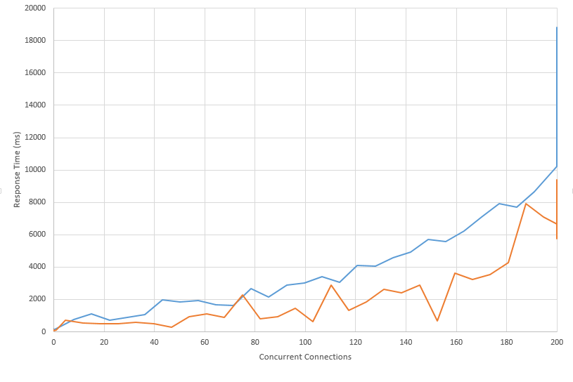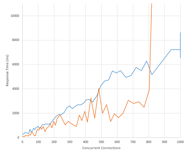 But this graph shows it pretty readily. As soon as you cross 800 concurrent connections FMA pukes. I didn’t scale the graph to show that spike, but it goes up to 40 seconds. So there appears to be a pretty hard limit of <800 concurrent connections (600 would probably be a pretty safe buffer…). If you exceed that limit your performance is going to tank, HARD. IMA, however, pushes on. With 16vCPU IMA didn’t break the 5000ms target until 570 concurrent connections. FMA appeared to be handling it just fine until it exploded.