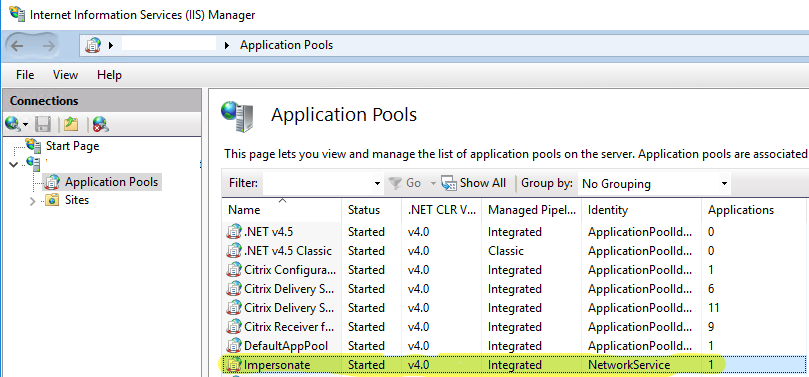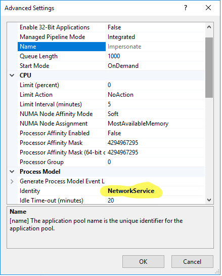 In order to set this up, I’ve created a web application in IIS with impersonation set.