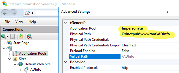 appcmd set app "Default Web Site/ADInfo" -applicationPool:Impersonate