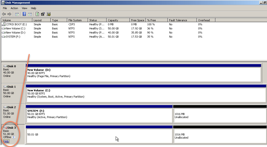 This error occurs because our uninstall did not remove the Citrix Storage controller driver, and when we did an install it added another Citrix storage controller. This new controller adds an additional disk but since the disk is in use from the original connection it comes up as “offline”.
