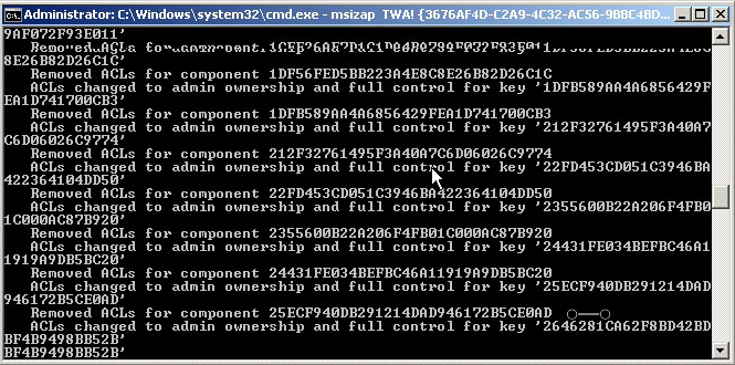 ::MSIZap destroys permissions – take ownership of all keys for EVERYONE then reset them to defaults SetACL.exe -on “HKEY_LOCAL_MACHINE\SOFTWARE\Microsoft\Windows\CurrentVersion\Installer\UserData\S-1-5-18\Components” -ot reg -actn setowner -ownr “n:S-1-1-0” -rec yes SetACL.exe -on “HKEY_LOCAL_MACHINE\SOFTWARE\Microsoft\Windows\CurrentVersion\Installer\UserData\S-1-5-18\Components” -ot reg -actn rstchldrn -rst dacl -rec yes SetACL.exe -on “HKEY_LOCAL_MACHINE\SOFTWARE\Microsoft\Windows\CurrentVersion\Installer\UserData\S-1-5-18\Components” -ot reg -actn setowner -ownr “n:S-1-5-18” -rec yes