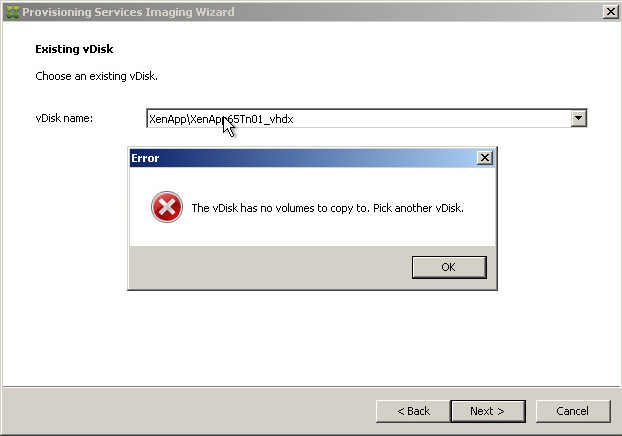 When using the “Provisioning Services Imaging Wizard” an error occurs “The vDisk has no volumes to copy to. Pick another vDisk.”