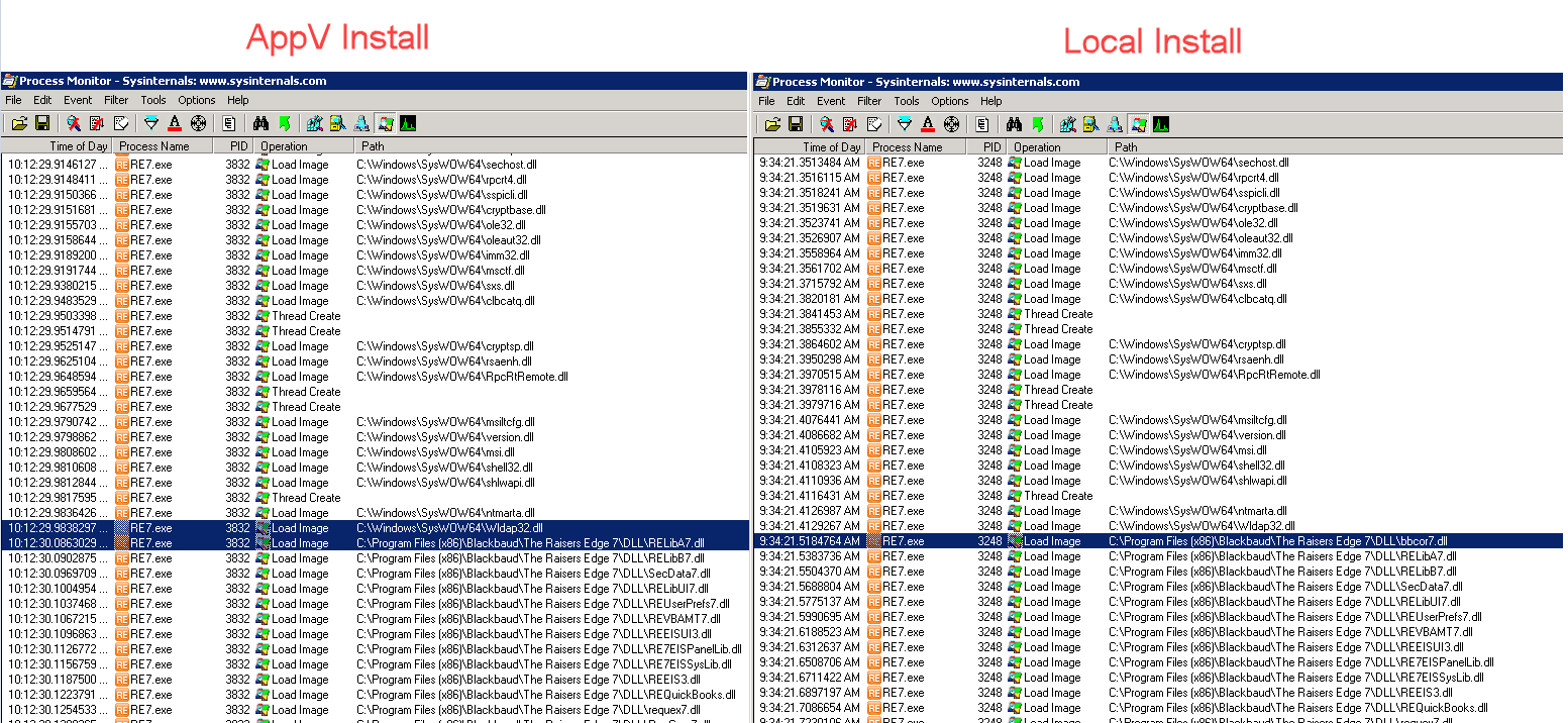 It appears, somehow, this file is getting loaded and registered dynamically on a local install, but this is not happening with the AppV install. I don’t see the file get searched for at all with the AppV install and tracing with procmon. However, executing a regsvr32 /s “C:\Program Files (x86)\Blackbaud\The Raisers Edge 7\DLL\bbcor7.dll” during sequencing does do all the necessary work to register and allow RE7.exe to find and load the file in an AppV bubble.