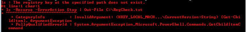 ls -Recurse -ErrorAction Stop | Out-File C:\RegCheck.tx