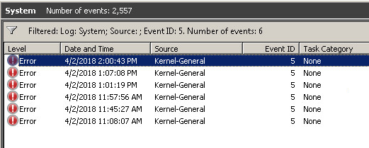 Filtering for EventID 5 shows all the attempts of booting to BSOD:
