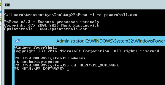 Next is to scan the registry for corruption. Thus far, I’ve only found corruption to be detectable if it’s a key or value that cannot be read. If the data on a value can be read but contains garbage it’s much harder to detect. In order to avoid permissions being a problem, I open a PowerShell prompt as SYSTEM using PSEXEC. If you don’t elevate permissions, some keys maybe restricted from the Admins group and this will be detected as a failure.
