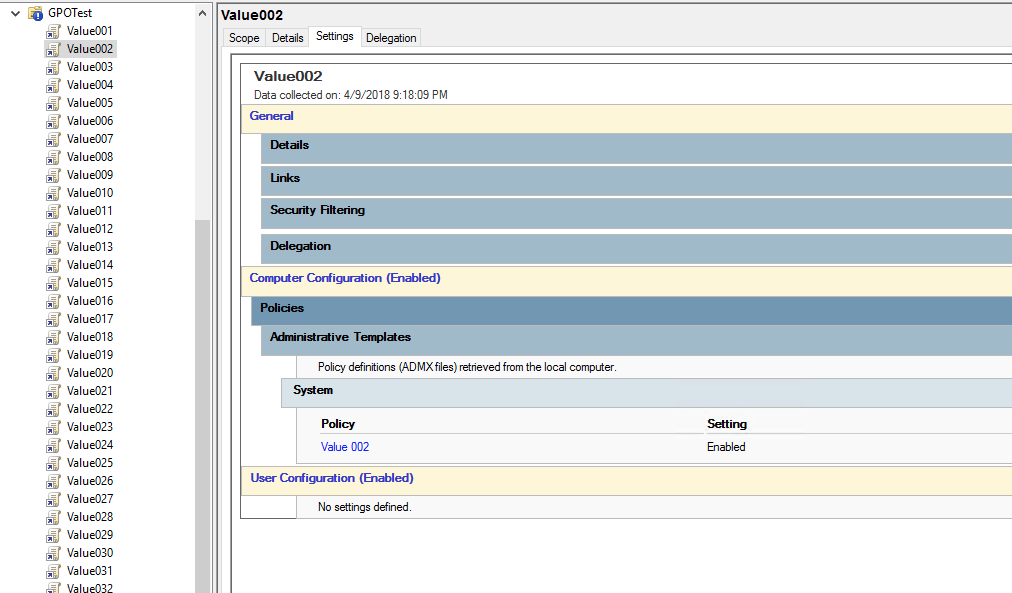 My test setup is very simple; a organizational unit (OU) with inheritance blocked to control the application of the GPO’s. I created 100 individual GPO’s with a single registry value, and 1 GPO with 100 values. I chose to do a simple registry addition as it should be the best performance option for group policy. I created a custom ADMX file for this purpose: