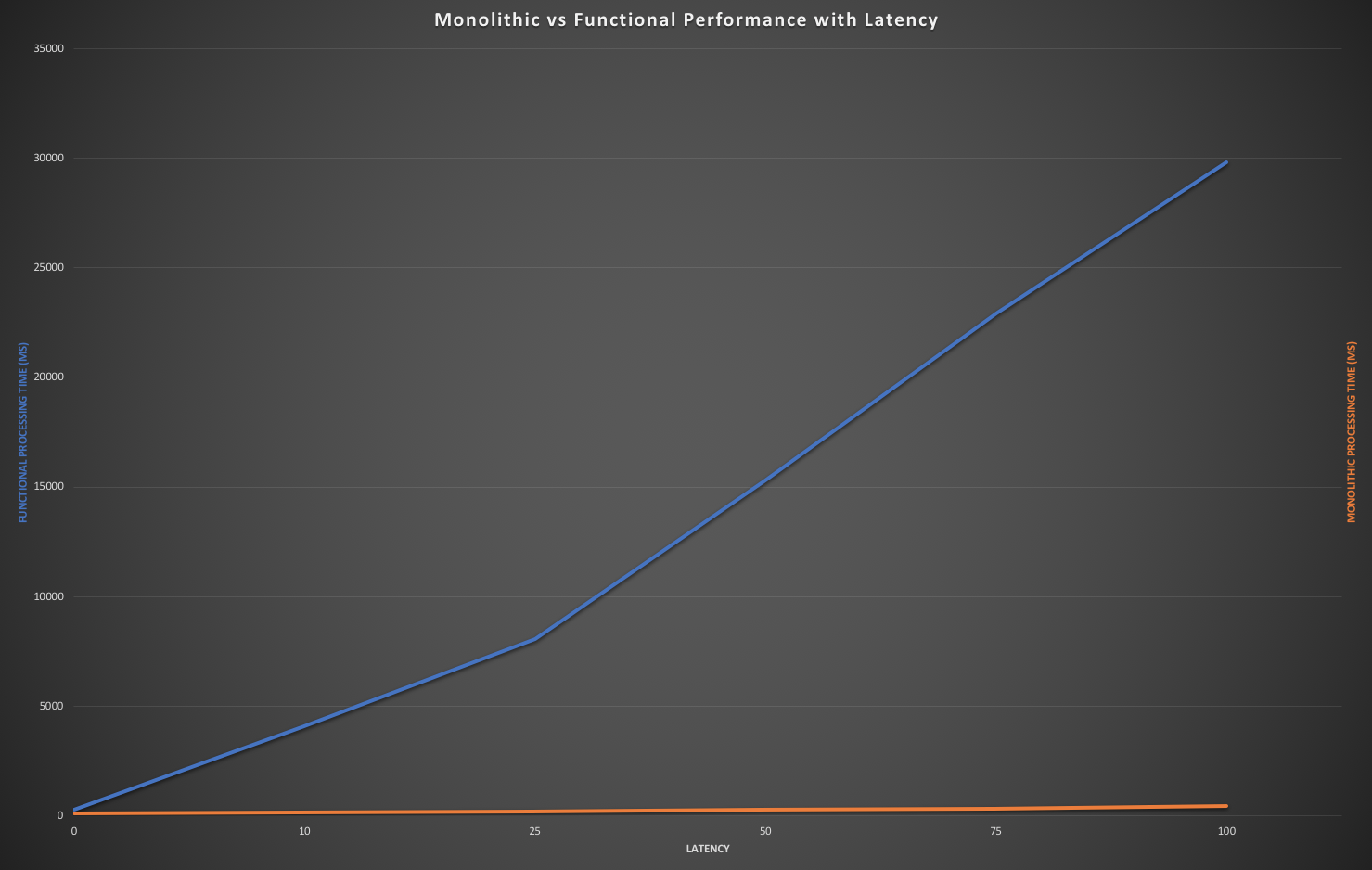 There is a huge edge to the monolithic design. Both in terms of how long it takes to process a single policy vs multiple policies and the resiliency to the effects of latency. Even ‘light’ latency can have a profound impact on performance. Going from 0ms to 10ms increased the length of time to process a functional design by 15 times! The monolithic design, on the other hand, was barely impacted. Even with a latency of 100ms, it only added ~300ms of time to process the policy. I would consider this imperceptible in the real world, where as the functional design going from ~271ms to ~4000ms would be an extremely noticeable impact! Let alone about 30 seconds at 100ms!