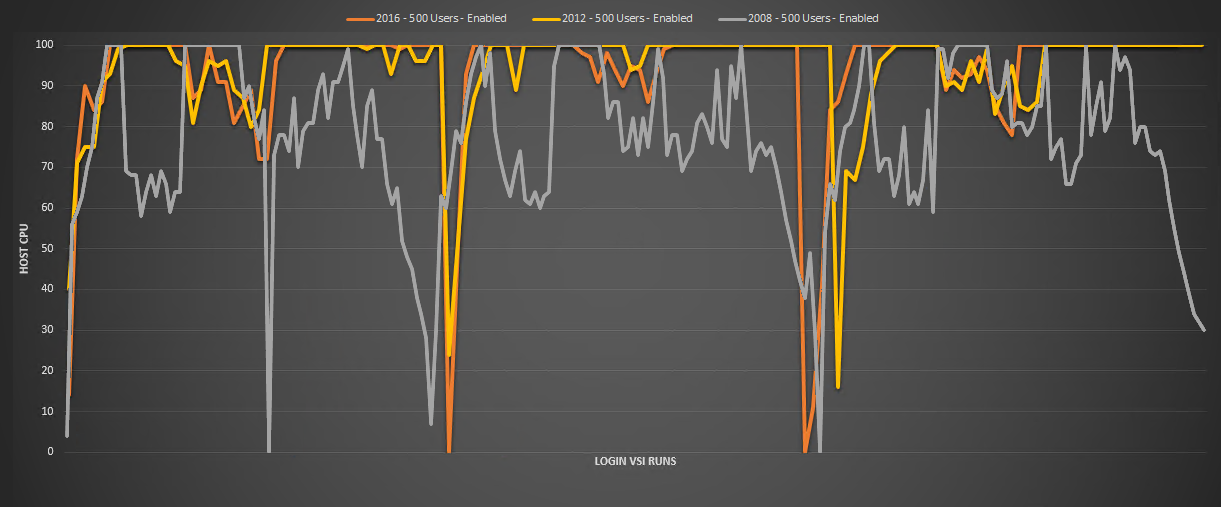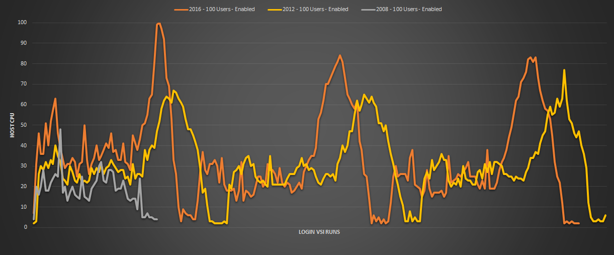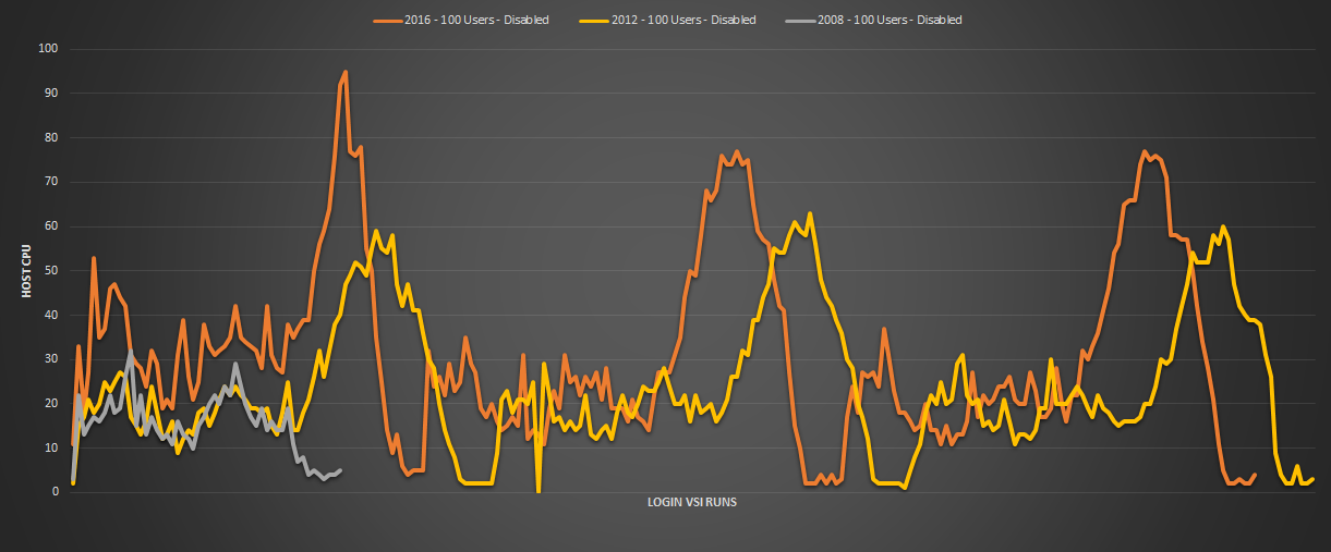 100 LoginVSI users with this workload, on Server 2016 we see the gap is barely visible, it looks even.