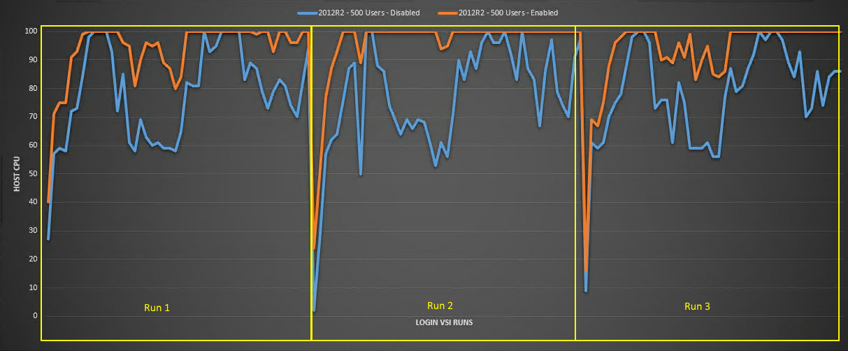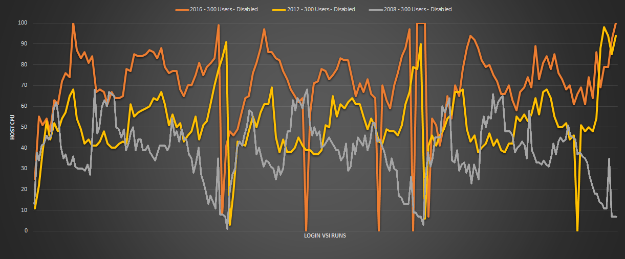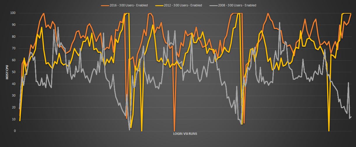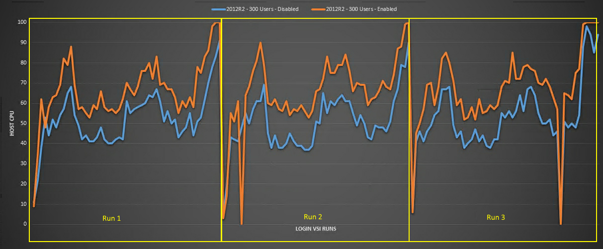 300 LoginVSI users in this workload on Server 2012R2. The separation between enabled and disabled is still very prominent.