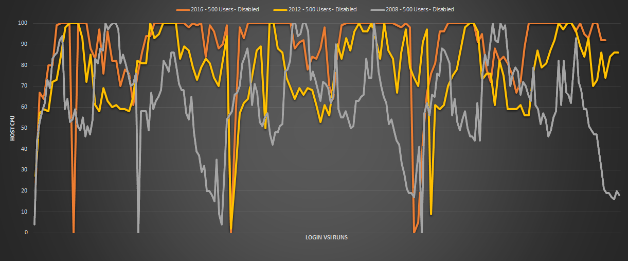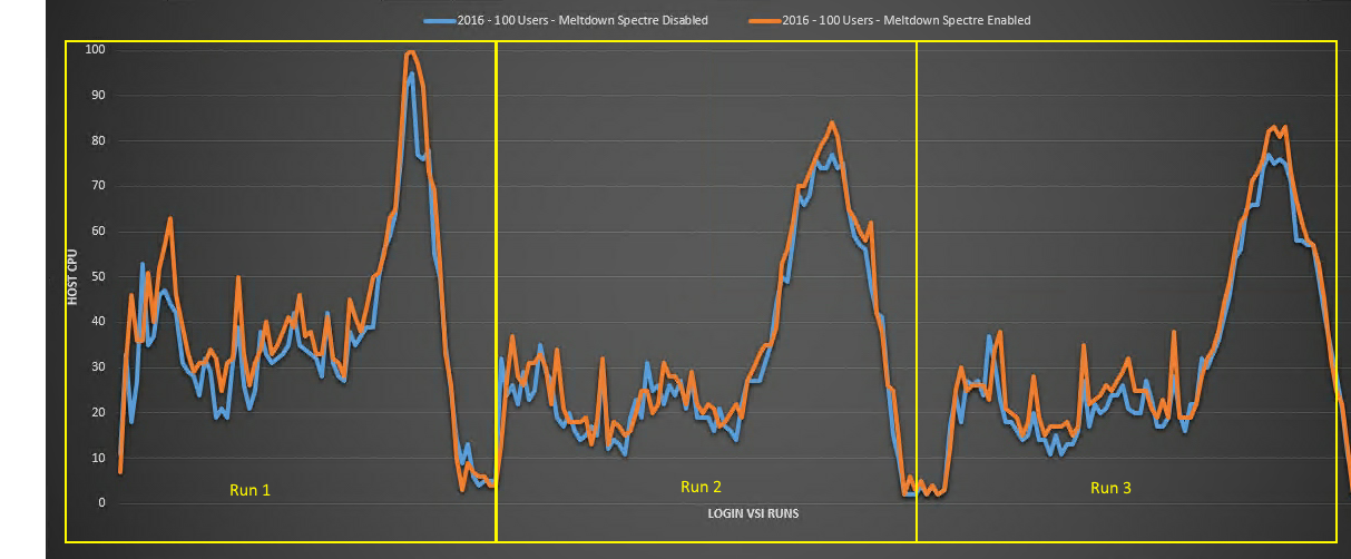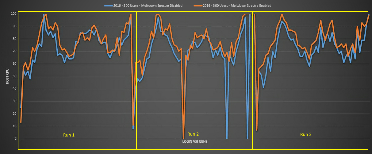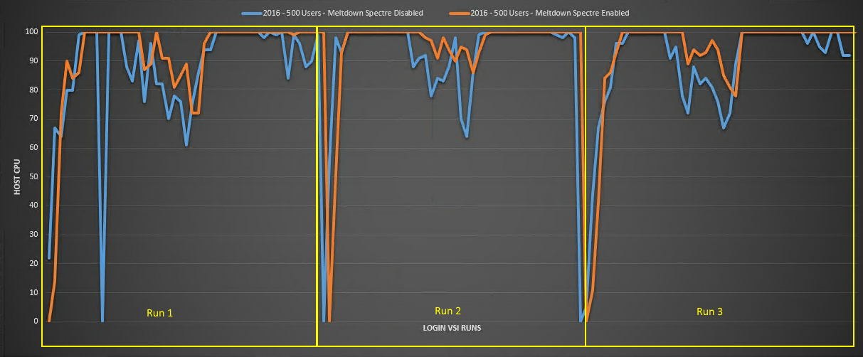 500 LoginVSI users with this workload, on Server 2016 pegged the hosts CPU to 100% on both the Meltdown/Spectre enabled and disabled hosts. We can still see the gap between the CPU utilization between the two with the Meltdown Spectre hosts