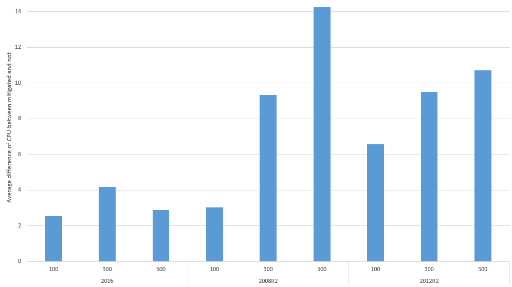 Microsoft stated that they expected to see less of an impact of the Spectre/Meltdown mitigations with newer operating systems. Indeed this does turn out to be the case. However, the additional resource cost of newer operating systems is actually *more* than running 2008R2 or 2012R2 with mitigations enabled . So if you’re environment is sized for running Server 2016, you probably have infrastructure that has already been spec’ed for the much heavier OS anyways. If your infrastructure has been spec’ed for the older OS than you will see a larger impact. However, if you’ve spec’ed for the larger OS (say for a migration activity) but are running your older OS’s on that hardware, you will see an impact but it will be less than when you go live with 2016.