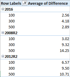 Again, interesting results. 2008R2 seems to have the largest average CPU seperation, hitting 14%, followed by 2012R2 at 11% and than 2016 having a difference of 4%.