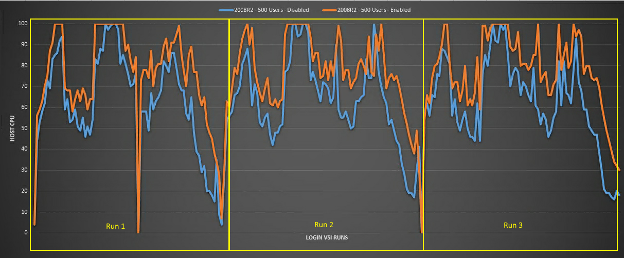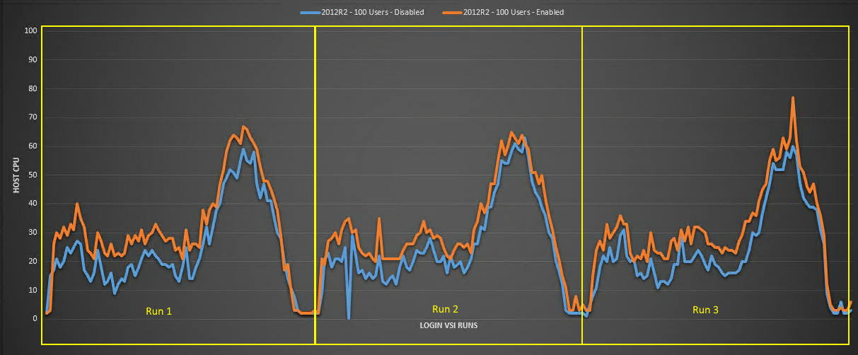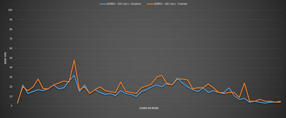 100 LoginVSI users in this workload on Server 2008R2. I only captured one run and the low utilization makes the difference barely noticeable.