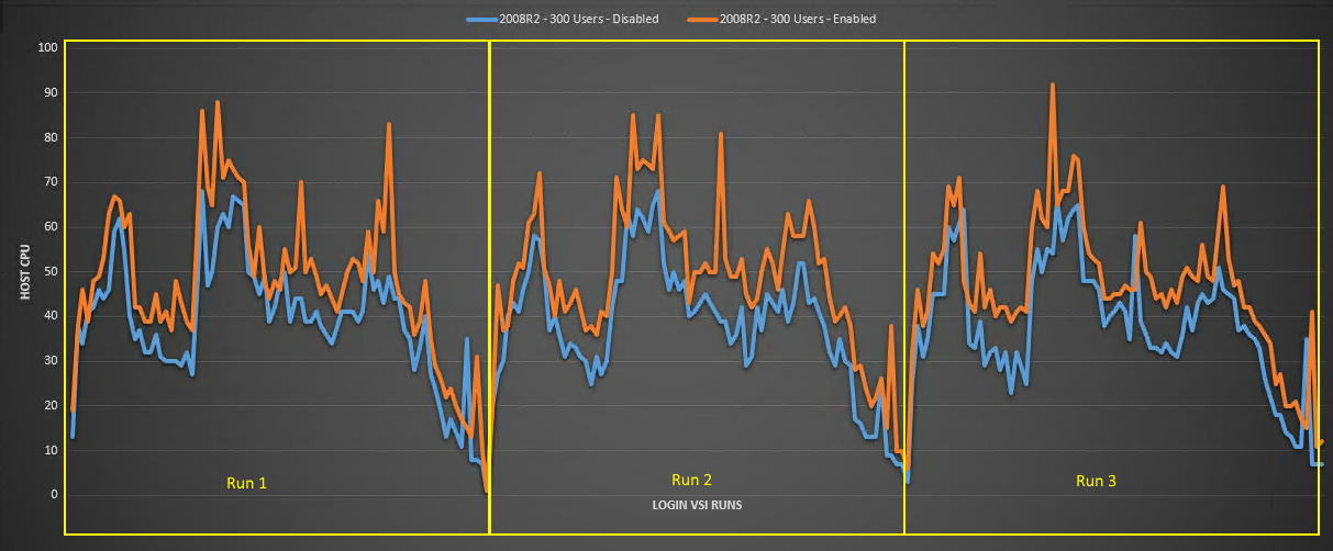 300 LoginVSI users in this workload on Server 2008R2. The separation between enabled and disabled is still very prominent.