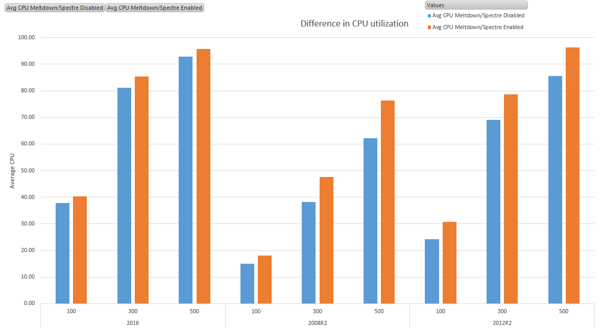 500 LoginVSI users in this workload on Server 2008R2. Noticeable additional CPU load with the Meltdown/Spectre host. A more interesting thing is it apperas overall CPU utilization is lower than 2012R2 or 2016.