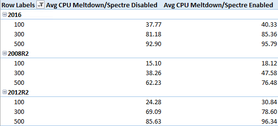 This shows it a little more clear. With mitigations enabled, Server 2008R2 can do 500 users at less average CPU load than 2016 can do 300 users with mitigations disabled.