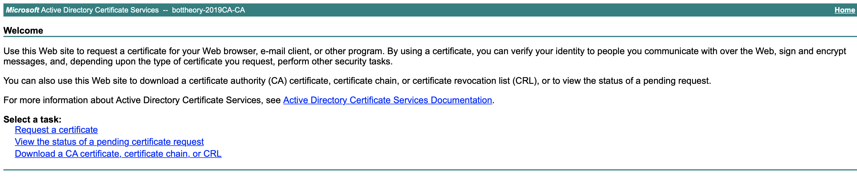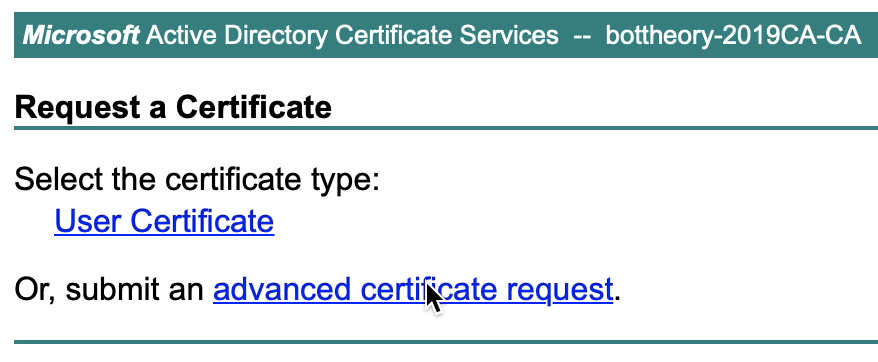 With that configured, we browse to the web enrollment page. This will be “https://%CAServer%/certsrv”