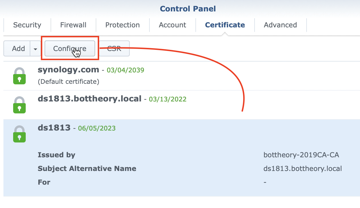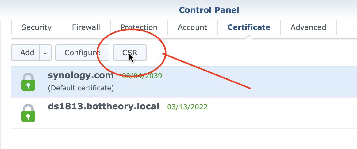 Go back to your Synology and go to the Control Panel, Security, Certificate and click on ‘Add’