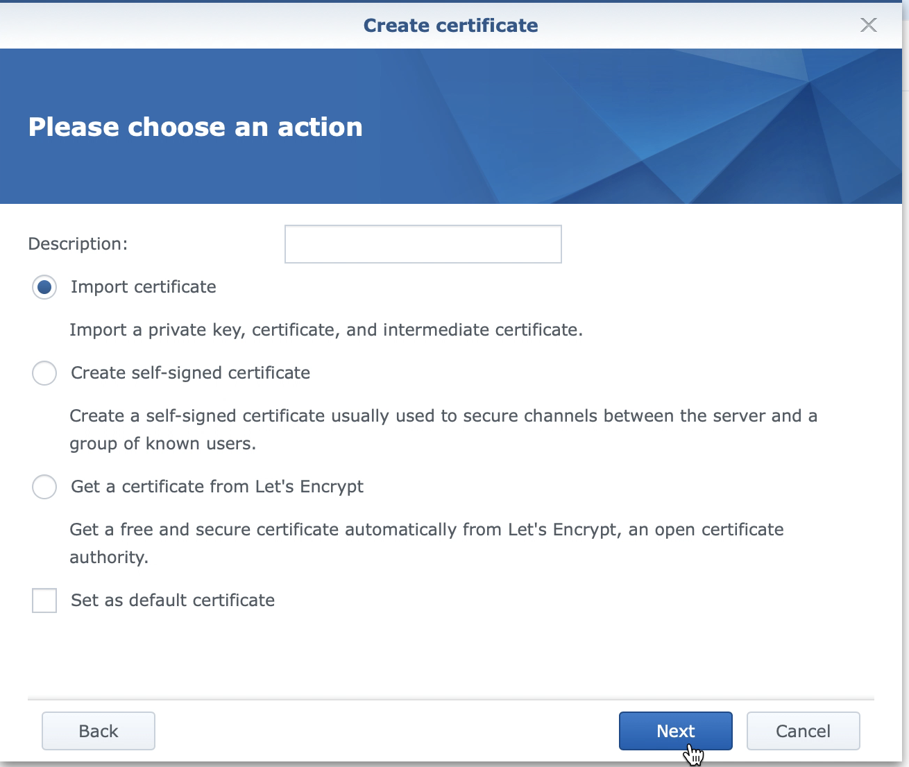 On the ‘Create Certificate’ pane, Synology is asking for 3 files. The Private Key, the certificate and any intermediate cerficates.