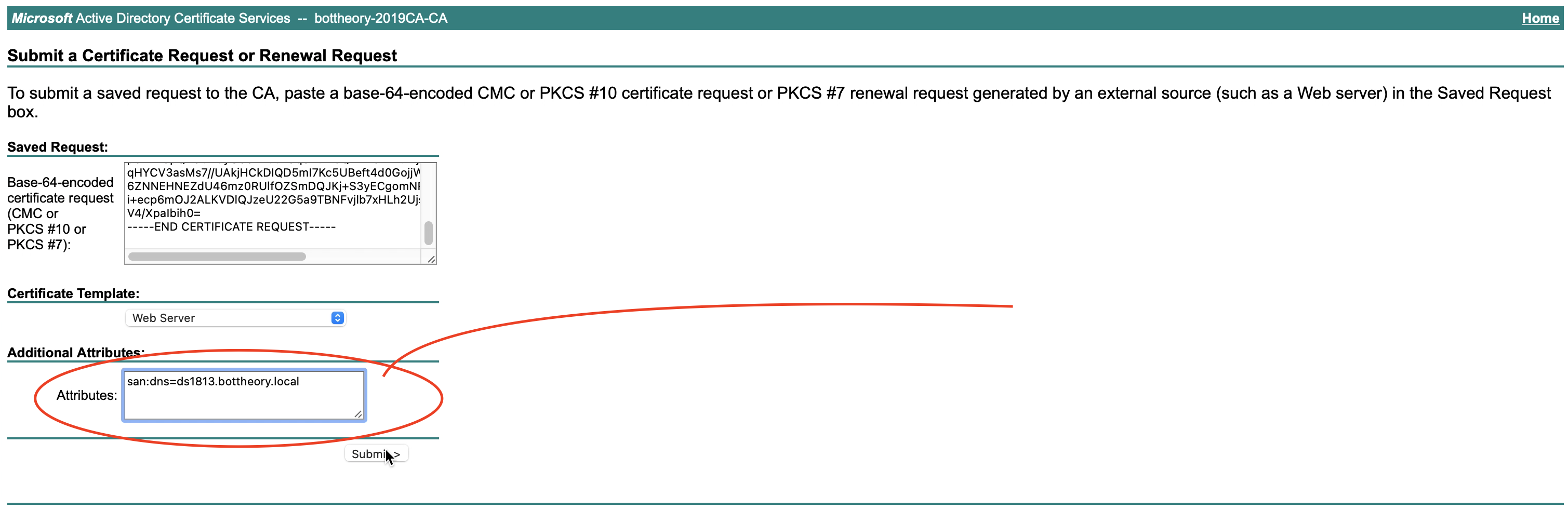 We just add the SAN entry to the ‘Additional Attributes’ dialog now: