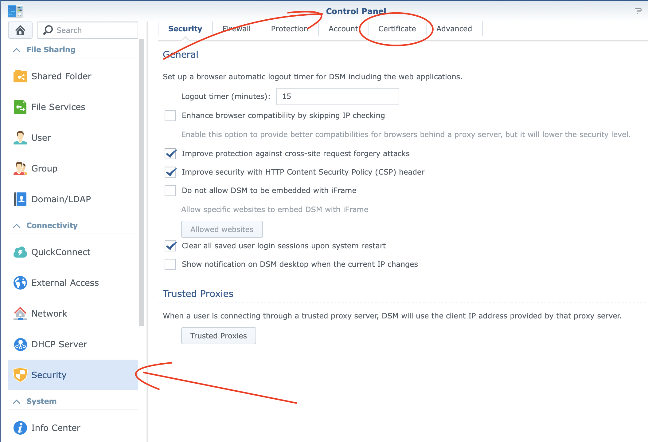 The first step is generating your certificate. In the Synology interface, open the Control Panel, select or search for Security and click on “certificate” in the button bar.