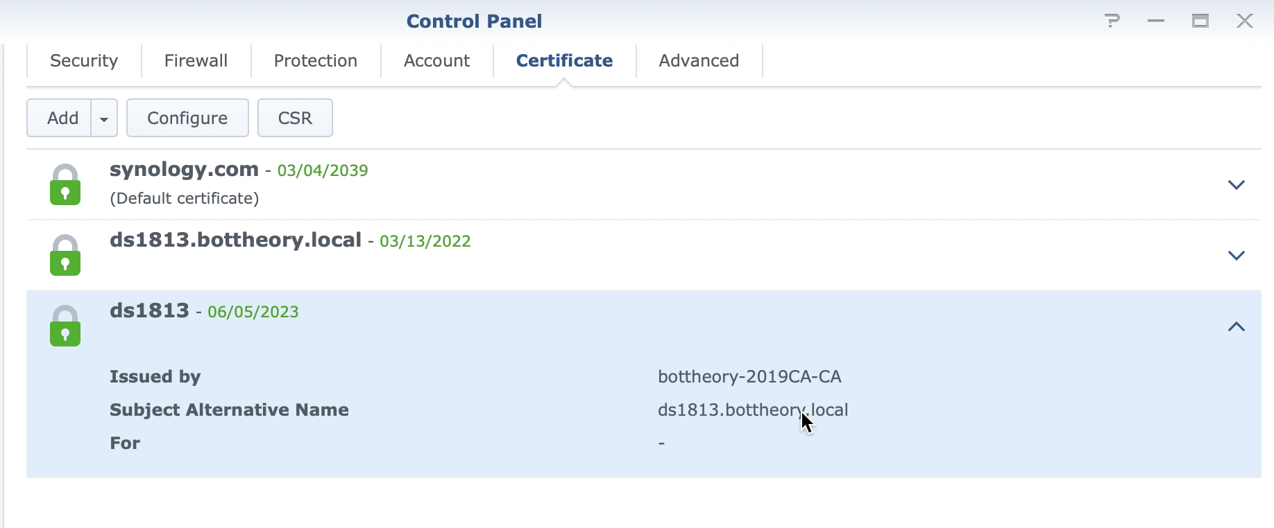 Once the certificate is imported, you can examine it. Ensure it has a SAN! The Synology web interface does show this.