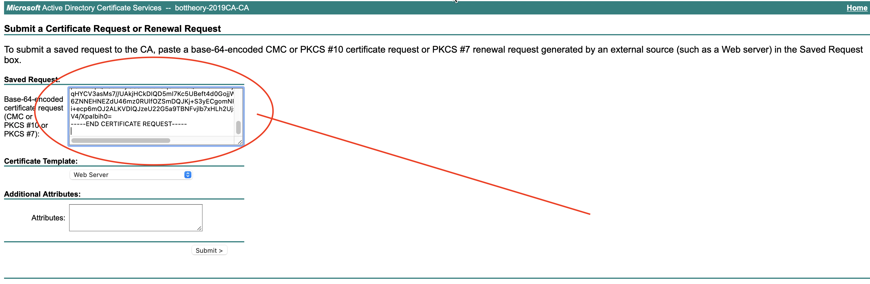 Go to the advanced certificate request page and paste the request into the ‘Saved Request’ dialog:
